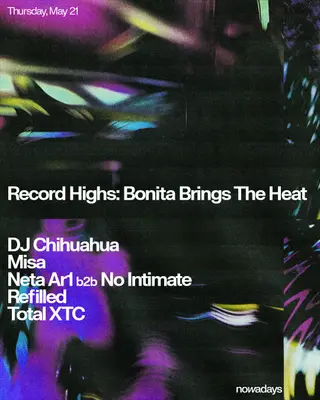 Record Highs: Bonita Brings The Heat on May 21, 2026 at Nowadays, New York City features Refilled, Total XTC, MISA and No Intimate performing DJ sets.