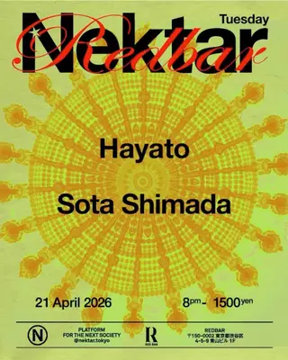 REDBAR TUESDAY takes place at Red Bar in Tokyo, Japan, on April 21, 2026. The lineup features Hayato, a techno artist known for his deep and driving sound, and Sota Shimada, who blends house and techno influences in his productions. Both artists contribute to the event's focus on techno and house genres.