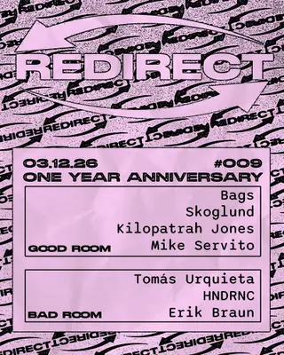 Redirect: Kilopatrah Jones, Mike Servito, Tomás Urquieta, Bags, skoglund, HNDRNC, Erik Braun takes place at Good Room in New York, United States on March 12, 2026. Featuring Kilopatrah Jones, Mike Servito, skoglund, Tomás Urquieta and 2 more. Techno and House sounds all night.