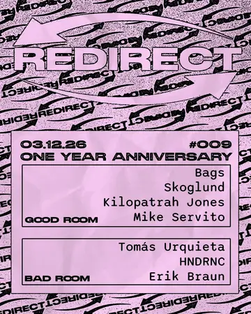Redirect: Kilopatrah Jones, Mike Servito, Tomás Urquieta, Bags, skoglund, HNDRNC, Erik Braun takes place at Good Room in New York City, Unknown on Thursday, March 12, 2026. Featuring Kilopatrah Jones, Mike Servito, skoglund, Tomás Urquieta and 2 more. Techno, House.
