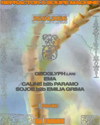 Refractor On Tour x Soupe Machine: Paris on April 25, 2026 at TBA - Bal Chavaux, Paris features Khey Mysterio, EMA (1) and Emilia Grima performing techno DJ sets.