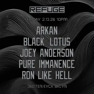Refuge Fridays with Arkan, Joey Anderson, Pure Immanence, Ron Like Hell, Black Lotus on February 13, 2026 at Refuge, New York features Arkan, Black Lotus, Joey Anderson, Pure Immanence and Ron Like Hell performing techno DJ sets.