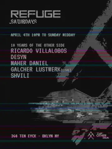 Refuge Saturdays with Ricardo Villalobos, Galcher Lustwerk, Maher Daniel takes place at Refuge in New York City, Unknown on Saturday, April 4, 2026. Featuring Ricardo Villalobos, Maher Daniel, Galcher Lustwerk, Desyn and 1 more.