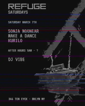 Refuge Saturdays with Sonja Moonear, DJ Vibe, Make A Dance, Kurillo takes place at Refuge in New York City, Unknown on Saturday, March 7, 2026. Featuring Sonja Moonear, DJ Vibe, Make A Dance, Kurilo.