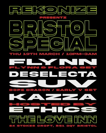Rekonize with FLYNN, SUV, Deselecta + Kazza takes place at The Love Inn in Bristol, United Kingdom on Thursday, March 19, 2026. Featuring Deselecta. Drum & Bass, Club.