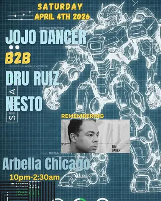 Remembering Tim Baker - JoJo Dancer B2B Dru Ruiz and Nesto takes place at Arbella in Chicago, United States on April 4, 2026. Featuring Dru Ruiz, Nesto. House sounds all night.