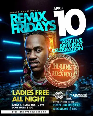 Remix Fridays DJ Ant Live Birthday at Made in Maxico – Apr 10 on April 10, 2026 at Made In Mexico, New York City features electronic music performances reggaeton DJ sets.