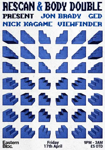 Rescan Records & Body Double present takes place at Eastern Bloc Records in Manchester, United Kingdom on Friday, April 17, 2026. Featuring Jon Brady, Nick Kagame, Viewfinder. Techno, House.