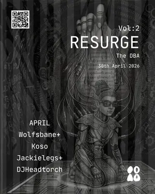 RESURGE takes place at The DBA in Manchester, United Kingdom on April 30, 2026. Featuring April (UK), KOSO, Egui, Kuriboh. Techno sounds all night.