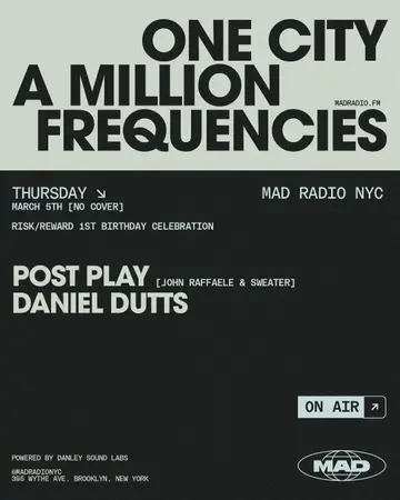 Risk/Reward 1st Birthday Celebration: Post Play (John Raffaele & Sweater) / Daniel Dutts takes place at MAD Radio NYC in New York City, Unknown on Thursday, March 5, 2026. Featuring John Raffaele, Daniel Dutts. Tech House, Minimal.