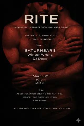 RITE takes place at TBA in Miami, United States on March 21, 2026. Featuring SATURNSARii, Winter Wrong. Techno and Experimental sounds all night.