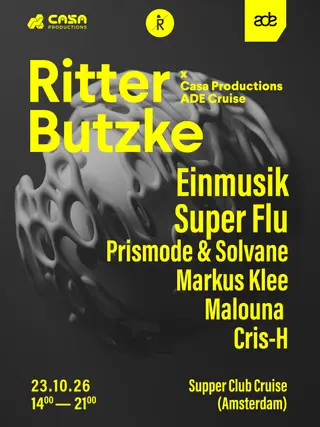 Ritter Butzke & Casa ADE Cruise takes place at Supperclub Cruise in Amsterdam, Netherlands on October 23, 2026. Featuring Einmusik, Super Flu. Progressive House and Afro House sounds all night.