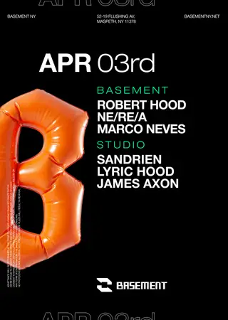 Robert Hood / Ne/Re/A / Marco Neves / Sandrien / Lyric Hood / James Axon takes place at BASEMENT in New York City on April 3, 2026. Featuring Robert Hood, Ne/Re/A, Marco Neves, Sandrien and 2 more.
