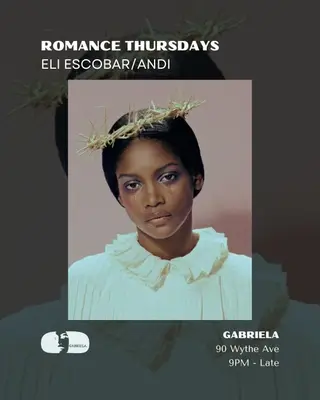 ROMANCE w Andi + Eli Escobar takes place at Gabriela in New York City, United States on April 9, 2026. Featuring Andi, Eli Escobar. Electro and Pop sounds all night.