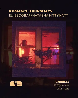 ROMANCE w Natasha Kitty Katt + Eli Escobar takes place at Gabriela in New York City, United States on April 16, 2026. Featuring Natasha Kitty Katt, Eli Escobar. Electro and Pop sounds all night.