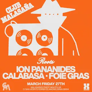 Roots feat. Ion Pananides takes place at Club Malasaña in Madrid, Spain on March 27, 2026. Featuring Roots (ES), Ion Pananides, Calabasa, Foie Gras. House and Electronica sounds all night.