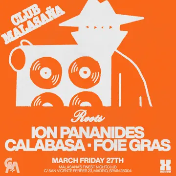 Roots feat. Ion Pananides takes place at Club Malasaña in Madrid, Spain on March 27, 2026. Featuring Roots (ES), Ion Pananides, Calabasa, Foie Gras. House, Electronica.