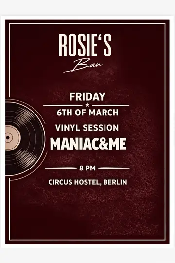 Rosie's Bar at Circus Hostel present: maniac&me Vinyl Session takes place at TBA in Berlin, Germany on Friday, March 6, 2026. Featuring maniac&me.