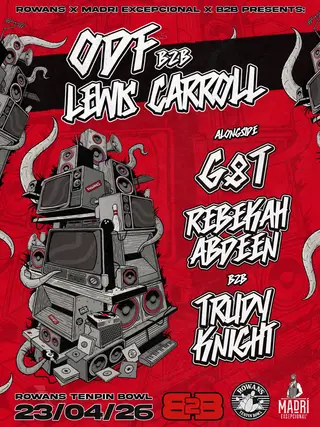 ROWANS X MADRI EXCEPCIONAL X B2B PRESENTS on April 23, 2026 at Rowans Tenpin Bowl, London features ODF (1), Lewis Carroll, G&T (2), Rebekah Abdeen and Trudy Knight performing house DJ sets.