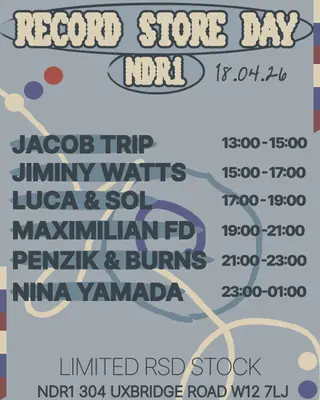 RSD W/ Nina Yamada, Penzik & Burns, Luca & Sol, Maximilian FD, Jiminy Watts, Jacob Trip takes place at Next Door Records in London, United Kingdom on April 18, 2026. Featuring Nina Yamada, Penzik & Burns, Luca and Sol, Maximilian FD and 2 more. House sounds all night.