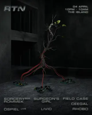 RTN 10⇒10 on April 4, 2026 at The Island, Bristol features Öspiel, Livid (UK), Rommek, Sorcery, Surgeons Girl, Field Case and Ceegal performing techno DJ sets.