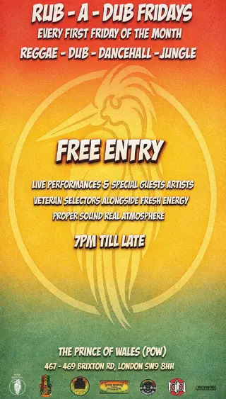 Rub - A - Dub Fridays at Prince of Wales takes place at The Prince of Wales in London, United Kingdom on April 3, 2026. Dub and Dancehall sounds all night.