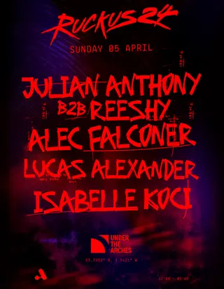 Ruckus24 - Julian Anthony, Alec Falconer, Reeshy, Lucas Alexander, Isabelle Koci on April 5, 2026 at Under The Arches, Leeds features Julian Anthony, Reeshy, Alec Falconer, Lucas Alexander and Isabelle Koci performing house DJ sets.