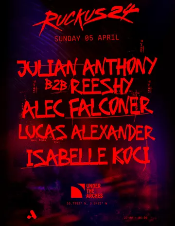 Ruckus24 - Julian Anthony, Alec Falconer, Reeshy, Lucas Alexander, Isabelle Koci takes place at Under The Arches in Leeds, United Kingdom on Sunday, April 5, 2026. Featuring Julian Anthony, Reeshy, Alec Falconer, Lucas Alexander and 1 more. House.