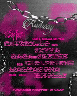 RUNWAY 4.5 - Fundraiser for GALOP on February 6, 2026 at The Bag Factory, Manchester features Girlfriend performing techno DJ sets.
