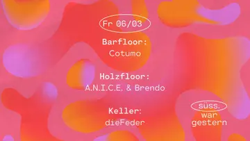 Set at Süss War Gestern, Süss am Freitag 2026 brings together artists and fans in Berlin on Friday, March 6, 2026, featuring Cotumo and A.N.I.C.E.. This event brings together artists and fans who share a passion for dance music culture and House, Tech House sounds.