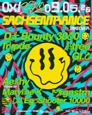 SACHSENTRANCE TAKEOVER [GARDEN + INDOOR] takes place at OXI in Berlin, Germany on May 9, 2026. Featuring Maryline K, Aexhy, djbounty3000, GI.O and 1 more. Trance sounds all night.