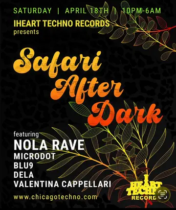 Safari After Dark takes place at TBA in Chicago, United States on Saturday, April 18, 2026. Featuring Blu9, Microdot, Dela (3). Techno, Minimal Techno.