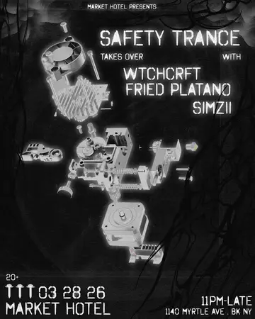 Safety Trance Takes Over Brooklyn with WTCHCRFT, FRIED PLATANO, Simzii takes place at Market Hotel in New York City, Unknown on March 28, 2026. Featuring Safety Trance, Cardopusher, WTCHCRFT, Simzii. Techno.