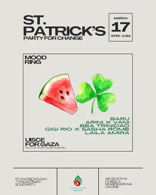 Saint Patrick's Day Party For Change takes place at Mood Ring in New York, United States on March 17, 2026. Featuring ARINI, VANI, Bea Trinidad, Gigi Rio and 2 more.