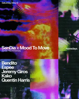 SanDia x Mood To Move: Bendito, Espee, Jeremy Giros, Kako, Quentin Harris on May 9, 2026 at Nowadays, New York City features Bendito, Espee, Jeremy Giros and Quentin Harris performing DJ sets.