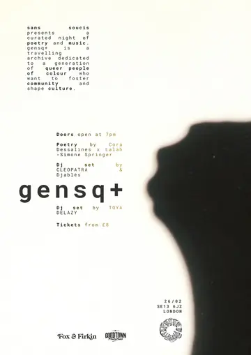 Sans Soucis (they/them) presents a curated night of poetry and music via gensq+, a travelling archive dedicated to a generation of queer people of colour who want to foster community and shape culture. This event will feature soulful, jazz-laced DJ set by Cleopatra, leading to a poetic conversation between friends, Cora Dessalines and Lalah-Simone Springer, plenty of time to socialize, and DJ sets by London-based, Martinican and Guadalupean Djablès, followed by South African London-based afrorave sensation Toya Delazy (dj set). Door open at 7pm Closing time: 11pm