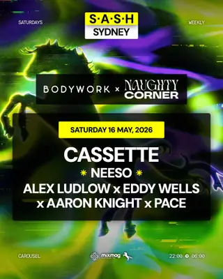★ S.A.S.H Sydney x Bodywork & Naughty Corner ★ Cassette ★ Saturday 16th May ★ takes place at Carousel Bar & Ballroom in Sydney, Australia on May 16, 2026. Featuring Cassette. Tech House and Deep House sounds all night.