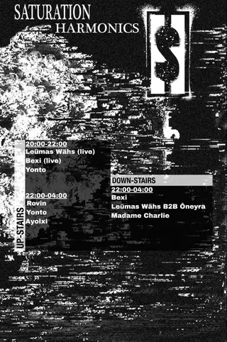 Saturation Harmonics (Label Launch) on April 24, 2026 at Mena Berlin, Berlin features Ayolxi, Bexi, Leümas Wähs, Ôneyra, Rovin, Yonto and Madame Charlie performing techno DJ sets.