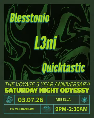 Arbella in Los Angeles, United States presents Saturday Night Odyssey - The Voyage 5 Year Anniversary Party 2026, a curated electronic music experience on Saturday, March 7, 2026, featuring L3Ni, BLESSTONIO, Quicktastic and 0 more artists. This event brings together artists and fans who share a passion for dance music culture and House, Deep House sounds.