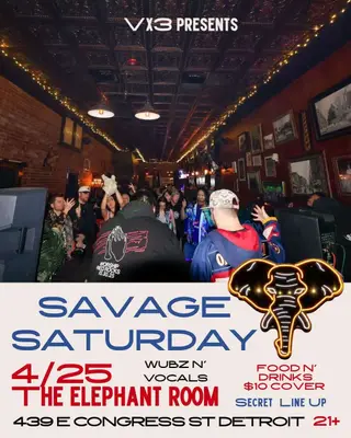 Savage Saturday takes place at The Elephant Room in Detroit, United States on April 25, 2026. Drum & Bass and Dubstep sounds all night.