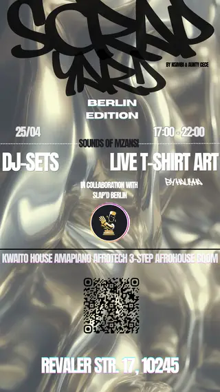 Set at Slap'd, SCRAPYARD 2026 brings together artists and fans in Berlin on Saturday, April 25, 2026. This event brings together artists and fans who share a passion for dance music culture and Kwaito, Amapiano sounds. Slap'd has hosted Kwaito events in Berlin as part of the area's regular club programming. It draws fans seeking authentic Kwaito music in Berlin. Designed for a discerning audience, Slap'd's programming draws fans of Kwaito music across Berlin. The production is designed to showcase the depth and diversity of contemporary electronic music.