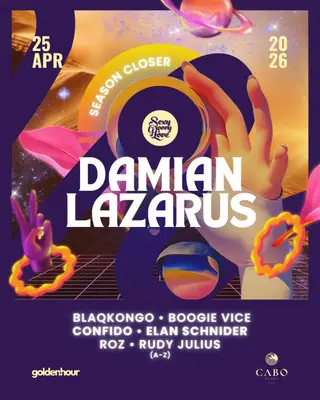 Season Closer ft. Damian Lazarus takes place at Cabo Beach Club in Cape Town, South Africa on April 25, 2026. Featuring Damian Lazarus, blaqkongo. Deep House and Disco sounds all night.