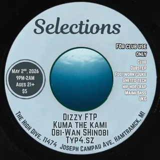 Selections takes place at The High Dive in Detroit, United States on May 2, 2026. Featuring Obi-Wan Shinobi, Dizzy FTP, TYP4, Kuma The Kami. Club and Ghetto Tech sounds all night.