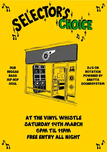 Selector's Choice takes place at The Vinyl Whistle in Leeds, United Kingdom on Saturday, March 14, 2026. Featuring Anatta Sound. Dub.