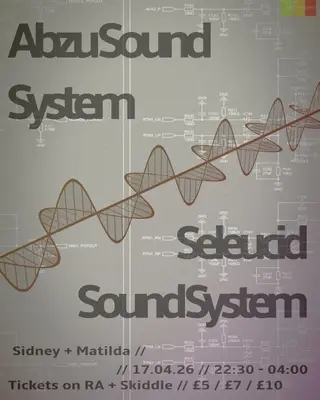 Set at Sidney & Matilda, Seleucid Soundsystem x Abzu Soundsystem 2026 brings together artists and fans in Sheffield on Friday, April 17, 2026. This event brings together artists and fans who share a passion for dance music culture and Dub sounds.