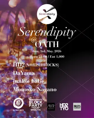 Serendipity at Oath in Tokyo on Sunday, May 3, 2026. Da Yama and junkie babe headline the event. The lineup features Techno music with 2 artists.