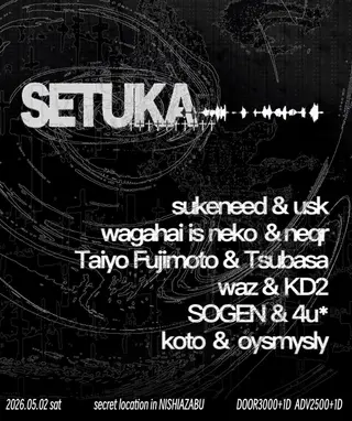 SETUKA takes place at TBA - Secret location in Nishi-Azabu in Tokyo, Japan on May 2, 2026. Featuring Usk°, WAGAHAI IS NEKO, TAIYO (2), waz (1). Techno and Acid sounds all night.