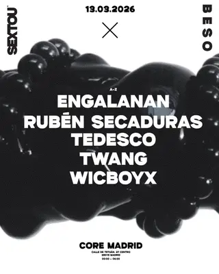 SEXTOU X BESO takes place at Core in Madrid, Spain on March 13, 2026. Featuring ENGALANAN, Rubén Secaduras, TEDESCO, Twang. Techno sounds all night.
