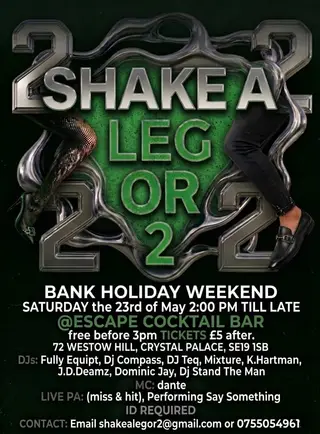 SHAKE A LEG OR 2 takes place at TBA - ESCAPE COCKTAIL BAR, SE19 1SB in London, United Kingdom on May 23, 2026. Featuring Tony Holden. House and Garage sounds all night.