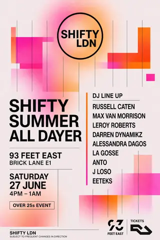 SHIFTY Summer All Dayer takes place at 93 Feet East in London, United Kingdom on June 27, 2026. Featuring Russell Caten, Darren Dynamikz, Leroy Roberts, La Gosse. House and Tech House sounds all night.